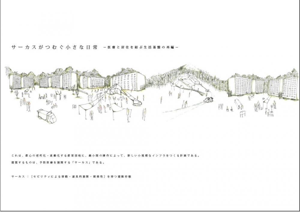 これまで団地再生というと、既存ストックを生かしつつ時代が要請する機能を付加・充足するという建物自体のリノベーションあるいはコンバージョンのイメージが強かった。ここではそこに重点を置くのではなく、人口構成が変化し、高齢化する近未来のコミュニティに不可欠な予防医療サービスを付加することで、団地の価値を上げようとする試みだ。その特徴は、固定的な施設にあるのではなく、サーカスのように移動しながらサービスを提供する機動的なネットワークにある。一種の巡回移動医療施設であるが、組み立て・解体・移動の建築システムがよく考えられている。対象とした戸山団地に限らず、かっての大型住宅団地には広い豊かな外部空間がある場合が少なくない。また、不要となる駐車場も増えるだろう。そのような外部空間を生かして団地を地域ぐるみで再生する視点もユニークだ。(小玉祐一郎)