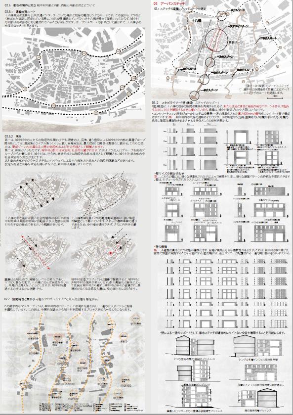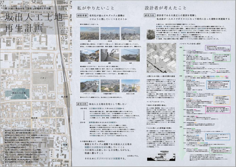 この提案は、メタボリスト大高正人によるモダニズム建築の名作であり、かつエポックメイキングとなった集合住宅でもある「坂出人工土地」の再生である。坂出人工土地は、1968年から4期に分けて完成し、「人工地盤」の上に市営住宅や広場、下に市民ホールと商店街、駐車場を配して市街地を再開発したものであり、築後50年を経過した。