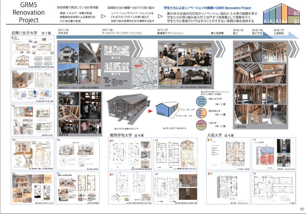 12戸からなる木賃アパートを6戸の住まいに再編するリノベーションプロジェクトである。3大学の学生が練った計15案のなかから、6つが実施に向けて動いている。土間などの中間領域を取り込むことで住まいを開こうとするアプローチ、既存の建物のありようを家族の将来に緩やかにつなげていこうとする姿勢など、学生らしい瑞々しさにあふれている。どの案もよく考えてつくり込まれており、何より暮らしが楽しそうである。その実現に向けては、不動産管理、法適合、構造、予算など各面からのブラッシュアップも図られており、このプロジェクトが目的に掲げる「教室だけでは学ぶことのできない大きな経験を得ること」の教育的効果は高かったものと思われる。学生を讃えるこの賞としては、案の実施に向けて学生がどう主体的に関わっていったか、3大学の6つの計画相互の連携はどう図られていったかなどについても、もっとアピールして欲しかった。(森田 芳朗)
