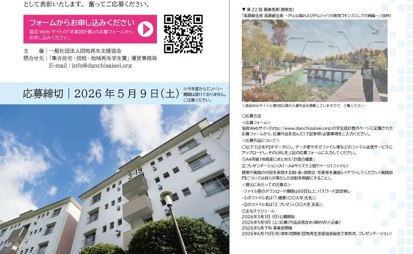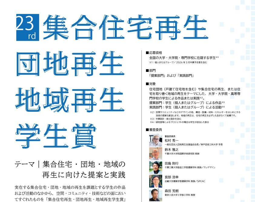 テーマは「集合住宅・団地・地域の再生に向けた提案と実践」です。実在する集合住宅・団地・地域の再生を課題とする学生の作品および活動のなかから、空間・コミュニティ・技術などの面においてすぐれたものを「集合住宅再生・団地再生・地域再生学生賞」として表彰いたします。奮ってご応募ください。