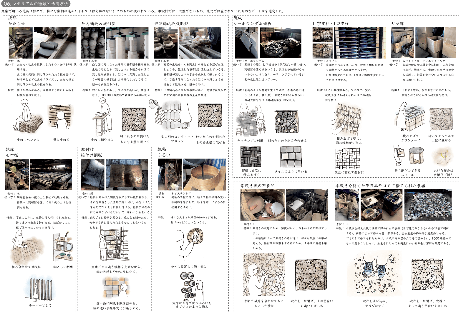 美濃焼の町、岐阜県土岐市下石町を敷地として、最盛期から取り残された、「使われなくなった道具」、「生産過程で出る不良品や捨てられる陶磁器」、「かつての下石町の窯業を支えた木造の釉薬工場兼倉庫」を再生する提案。