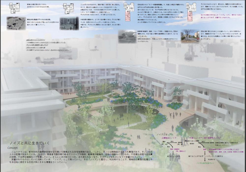 団地は、標準の繰り返しが平坦で均質な風景を創りだし、加えて生活の滲み出しを制限してきた。環境ストックといっても、大きく育った樹木以外のよりどころが少なく、建築が創り出す空間的場所性に欠ける。そこに、放置された過去の歴史(ノイズ)や標準からはずれた自然的条件に着目し、新たな場所性を創りだそうという提案は良い。標準的につくられた増築スペースも同様であり、その共用空間化も一定の範囲で頷ける。しかし、そのアイデアだけで空間を(生活と関係させて)解決できるかと言えばそれは難しい。住民参加をうまく活用して空間の再編にまで持っていくには空間の総体に対する理解と能力のある専門家の参加が不可欠であるように、提案者にはそういったレベルにまで育ってほしいと期待して、優秀賞に推薦した。(江川直樹)