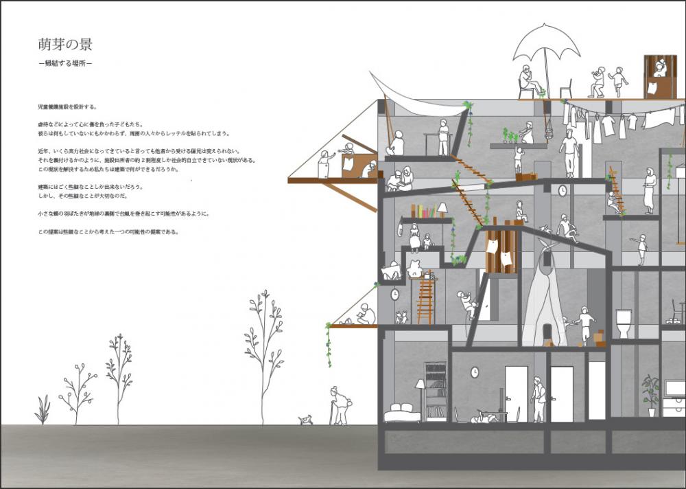 団地を児童養護施設へと転用するという意欲的な提案。児童養護施設計画と団地再生というとどちらも社会的に重い課題を抱えた対象なので、本提案をどちらの軸で評価すべきかを迷う。本提案の作者は団地を「どう使ってもよさそうなストラクチャー」ととらえ、その自由さが児童養護施設にとって相応しいと感じたのだろう。その感覚を評価する声がある一方で、もう一方の軸である団地再生という点においては、団地再生の第一線に立つ委員からスケールアウトしている点を疑問視する声もあった。(乾久美子)