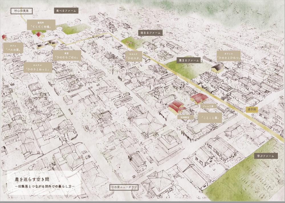この計画は、かつての集落を宅地開発したものの、空き区画のまま残っていたり、空き家が増えた住宅地を再生させようとするものである。その再生にあたっては“農”をテーマとして、空き地と空き家に、農に関わる人・もの・食を配置していくことで、住宅地エリアと周辺集落を連携させた郊外住宅地の新しい暮らしとコミュニケーションをつくりだそうとしている。