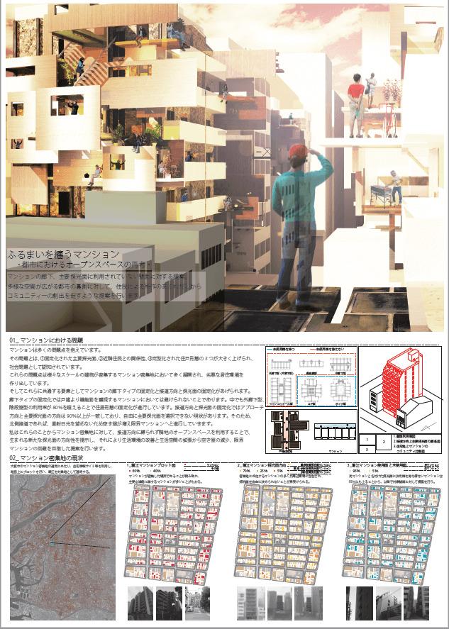 マンションが密集する地区での計画である。一般的にマンションの採光面、アクセス面は限られているが、隣地との隙間にあたる部分等、従来十分に利用されてこなかった面を、床や壁、垂直動線の追加等によって中間領域的に利用できる空間に変え、各住戸の暮らしの場としての豊かさだけでなく、マンションや地区の住み手相互の新たな関係性をももたらそうとした意欲的な提案である。マンションの密集地区は、これまでこうした学生の設計においても充実した取組みがなかなか見られなかった対象であり、それを対象として選び、増築的な操作を加えることで、その生活空間としての可能性を引き出そうとしたテーマ設定と意欲は高く評価できるものである。丹念な地区の調査とその分析に基づいて計画されている点も好感が持てる。この操作によって光、熱、通風等の環境面での質がどのように向上できるか、またそれぞれの権利関係の整理をどう進めるか等について更に検討を加えれば、現実社会に大きなインパクトを与え得る提案に繋がるであろう。