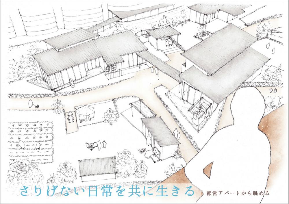足立区にある古くから都営アパートを中心とした住宅街を対象とした案である。建て替えの進む都営アパート、再編される周辺環境を把握した上で、そこに住む高齢者や居住者のニーズを分析し、このエリアに暮らすコミュニティのあり方を検証している。単に住む場所のデザインではなく、住む場と場とを結びつけるようなコミュニティを繋ぐ場を創り出し、喫茶室は学童施設、あるいは療育室や食堂、そして菜園やデイサービスなど、日々の暮らしを支える施設を計画している。