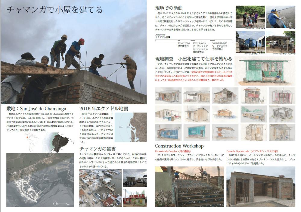 2016年4月のエクアドル地震(マグニチュード7.8)で被災した小さな漁村チャマンガの復興をテーマにした案。政府による復興案は漁師小屋や商店のあった海ぎわはクリアランスされ公園となり、復興住宅は内陸に建てられるというものであった。これをこの提案者は当該地での生活と乖離したもので有るととらえた。彼は現地で2ヶ月ほど暮らしながら詳細な調査を行い、現地の人たちの生業が継続していける形を模索し、海際のエリアと内陸の復興住宅を含む新たな生活圏が提案した。もともと現地にあった近所が助け合うセルフビルドの習慣(MINGA)を生かしながら、建築の専門的な知恵を加えて、海ぎわに漁業や観光に関わる小屋を作る計画となっている。