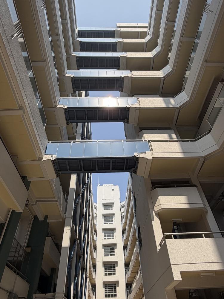 建物は耐震補強工事済みでした。通路は後から利便性の向上のためにつなげたのでしょうか?色が異なっています。