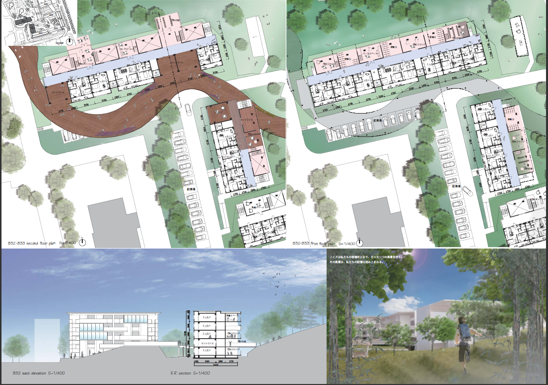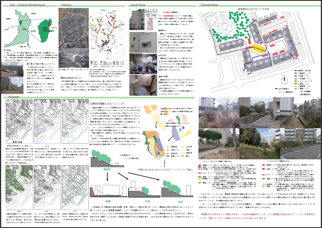 団地は、標準の繰り返しが平坦で均質な風景を創りだし、加えて生活の滲み出しを制限してきた。環境ストックといっても、大きく育った樹木以外のよりどころが少なく、建築が創り出す空間的場所性に欠ける。そこに、放置された過去の歴史(ノイズ)や標準からはずれた自然的条件に着目し、新たな場所性を創りだそうという提案は良い。標準的につくられた増築スペースも同様であり、その共用空間化も一定の範囲で頷ける。しかし、そのアイデアだけで空間を(生活と関係させて)解決できるかと言えばそれは難しい。住民参加をうまく活用して空間の再編にまで持っていくには空間の総体に対する理解と能力のある専門家の参加が不可欠であるように、提案者にはそういったレベルにまで育ってほしいと期待して、優秀賞に推薦した。(江川直樹)