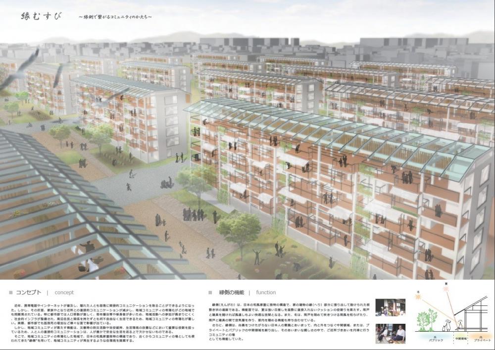 ピロティと屋上をつないで考えている点が面白い。コルビュジェの理想だろうか。建物の老朽化、住民の高齢化・無縁化が進んだ団地の現実を踏まえて、耐震補強と同時に、若い人にとって魅力的な空間にすることをめざした改修案。「縁結び」というキーワードで、となり近所とのコミュニケーションを増進する「縁側」増設には共感するが、増設するための構造的、環境的な配慮についてのテクニカルな考え方・アイデアも示して欲しいところ。また、増設の伴う建物間のオープンスペースや周辺の環境への影響はどのように考えたのだろうか。きっちりした図面表現は好感が持てる。現実性を帯びたスケール感も良い。ただし問題は、構造要素について、既存部分に新たなストラクチャーを付加することは外部空間を削減するわけだが、これについて何のフォローもない。屋外と屋内をむすびつける縁側という要素を考えたなら、その周辺にひろがる屋外空間の魅力にも目をむけてほしいような気がする。また縁側によってリニューアルされた棟同士が、どのようにネットワーク化され役割分担されるのだろうか?団地全体に対する構想に提案がないことも残念である。