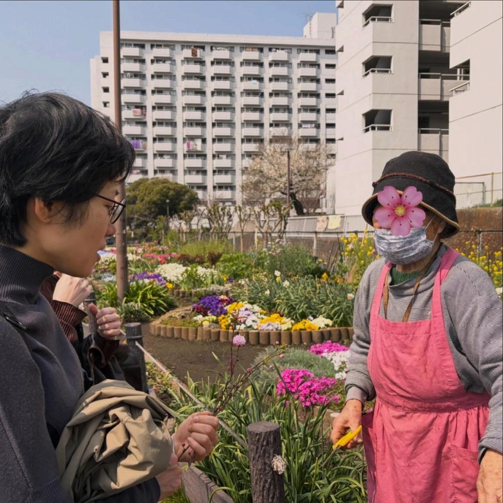 団地の南側にある「さいわい緑道」には、河原町団地の各自治会が管理する花壇がありました。ちょうど、いいお天気で花壇の手入れをする90代の女性(団地歴30年以上)とお話しができました。